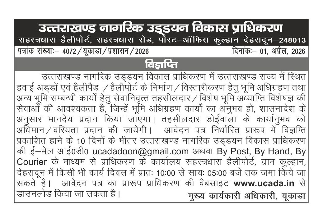 संविदा के आधार पर सेवानिवृत्त तहसीलदार / विशेष भूमि अध्याप्ति विशेषज्ञ की सेवाओं हेतु विज्ञप्ति |