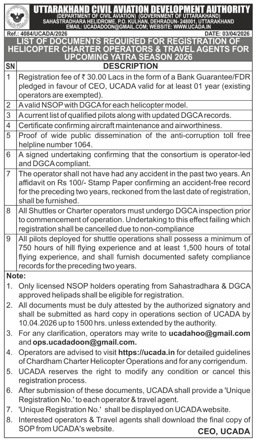 REGISTRATION OF HELICOPTER CHARTER OPERATORS FOR UPCOMING YATRA SEASON 2026
